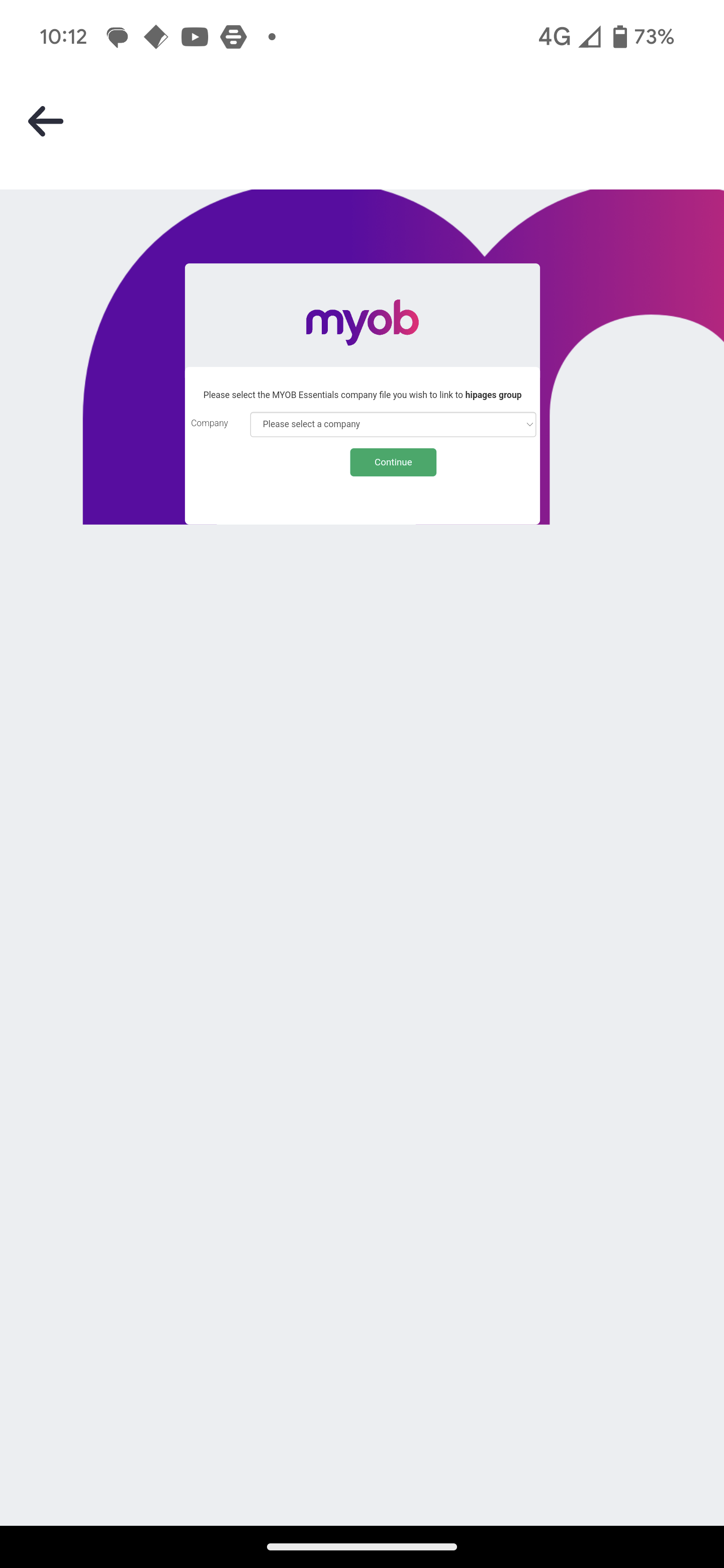 Using the drop-down list, choose the company file that you want to connect with hipages tradiecore and select Continue.