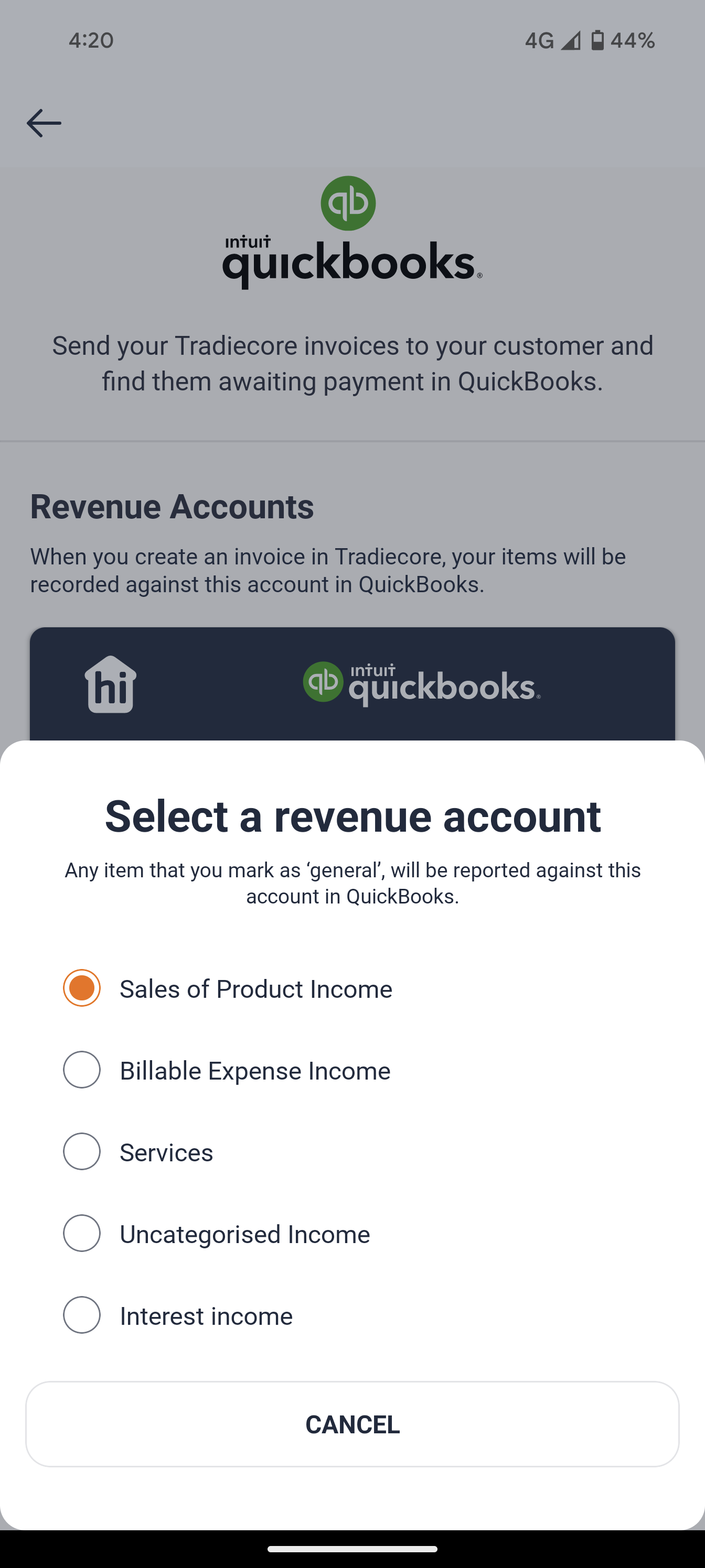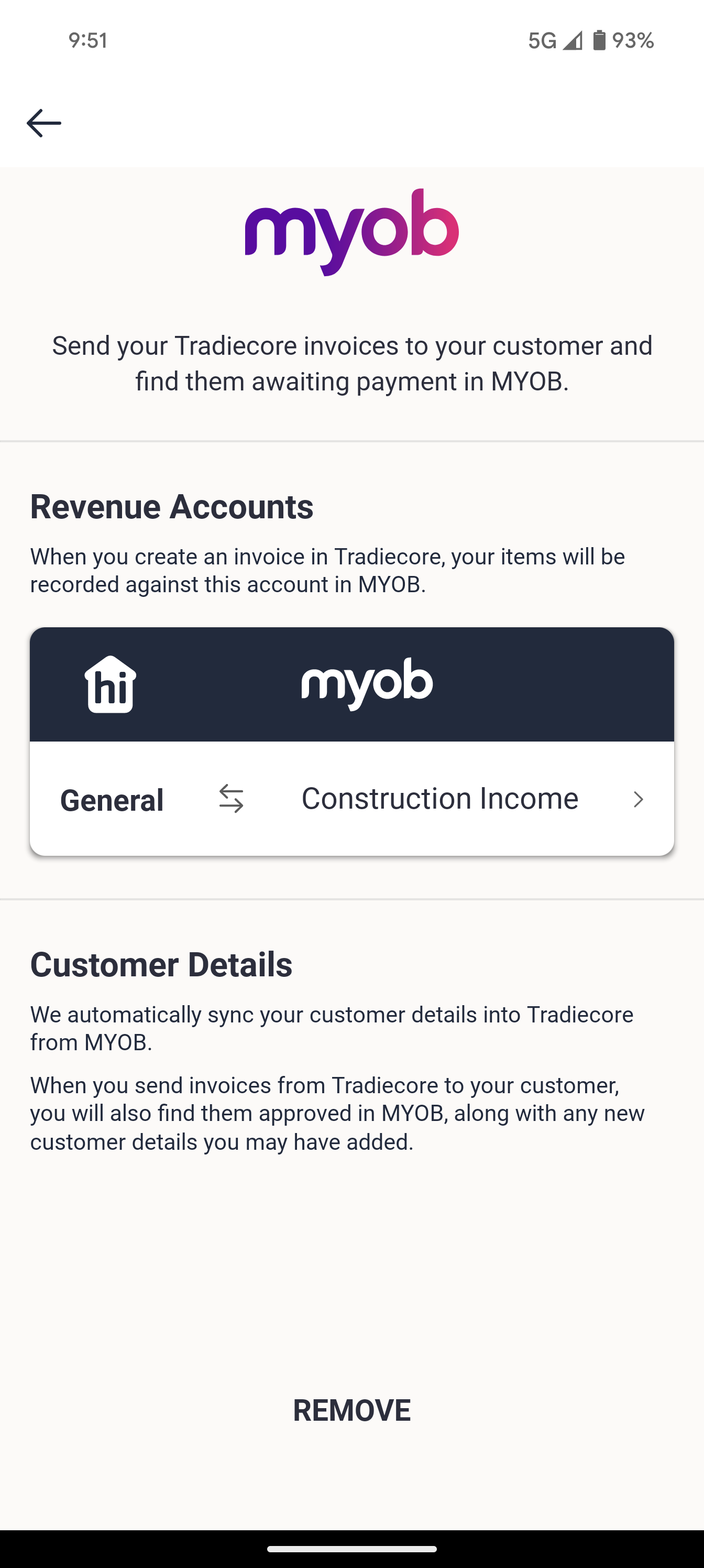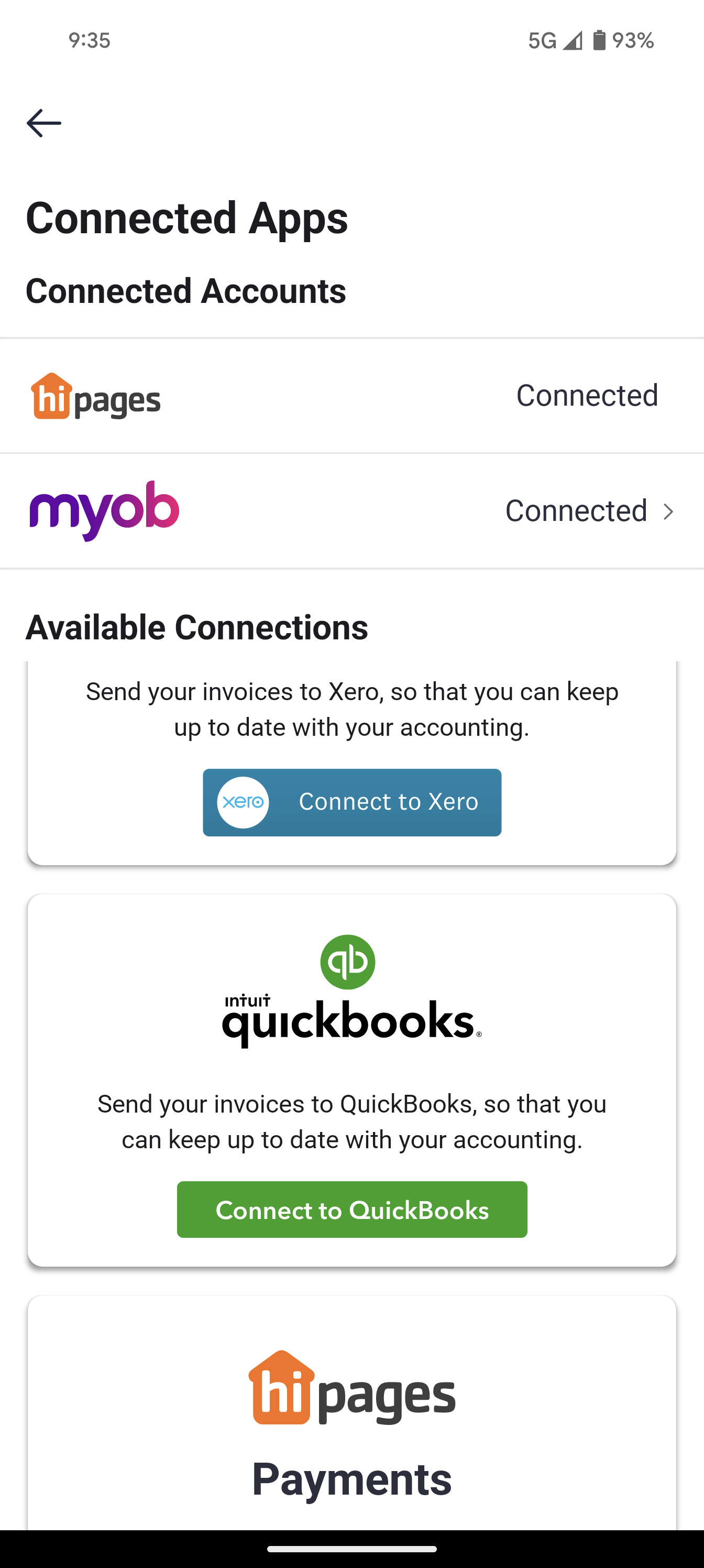 When MYOB has successfully connected to hipages tradiecore the Connected Apps screen is updated to show your account connection. Your invoices will also be updated to show that they have been sent to MYOB.