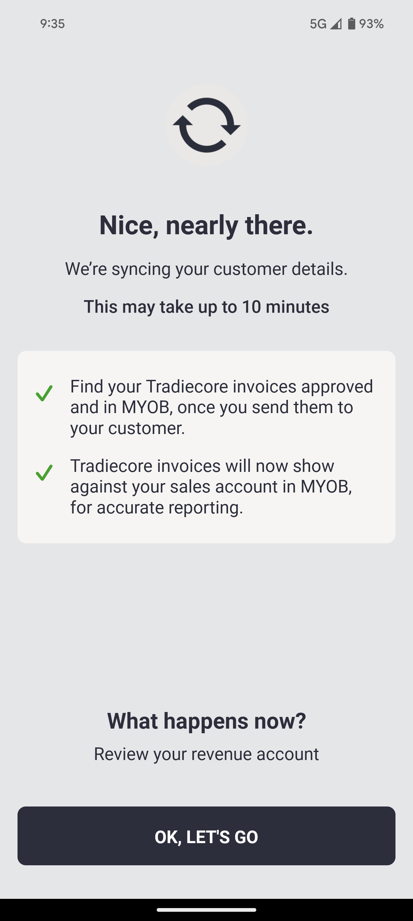 Your customer and invoice information will be automatically synchronised between MYOB and hipages tradiecore. This process may take up to 10 minutes. When complete, select Ok, lets go.