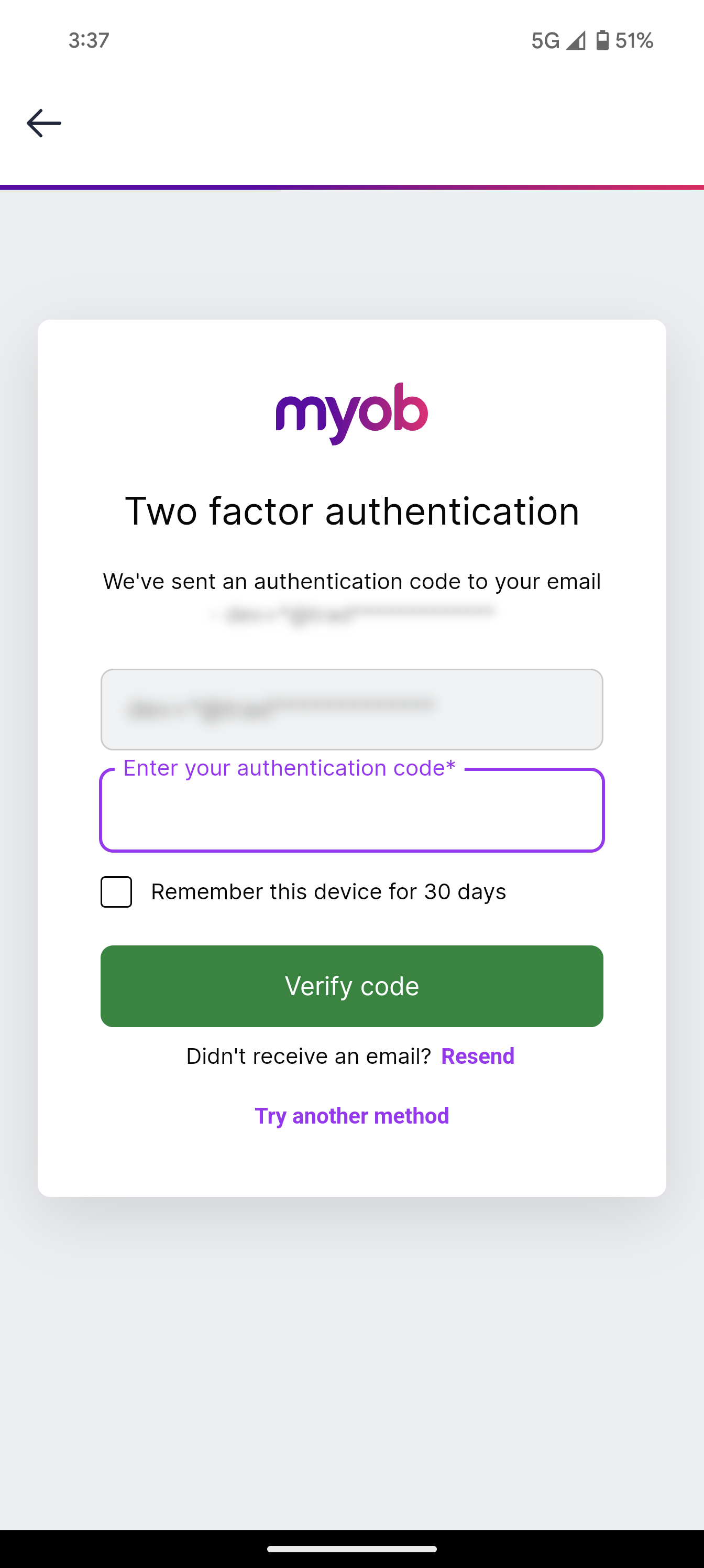 For verification, you will be prompted to enter a code sent to you by MYOB. Enter the code and select Verify.