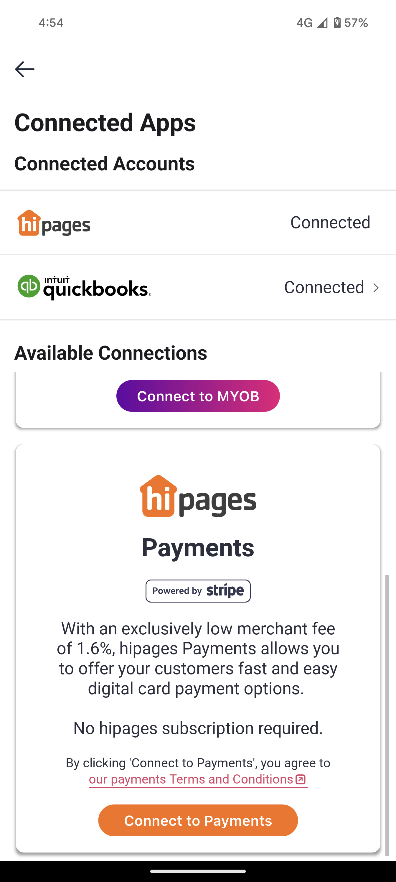 When QuickBooks has successfully connected to hipages tradiecore the Connected Apps screen is updated to show your account connection. Your invoices will also be updated to show that they have been sent to QuickBooks .