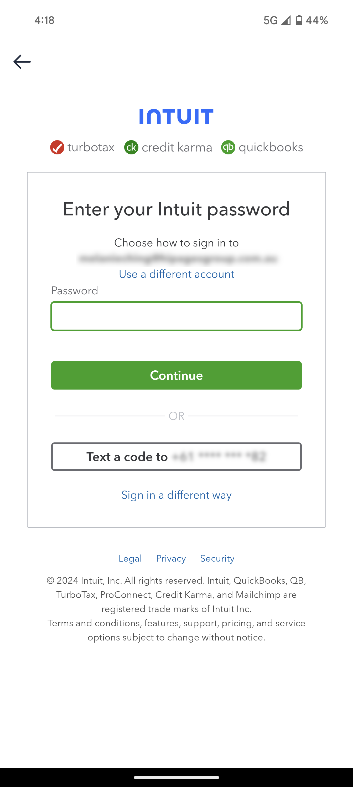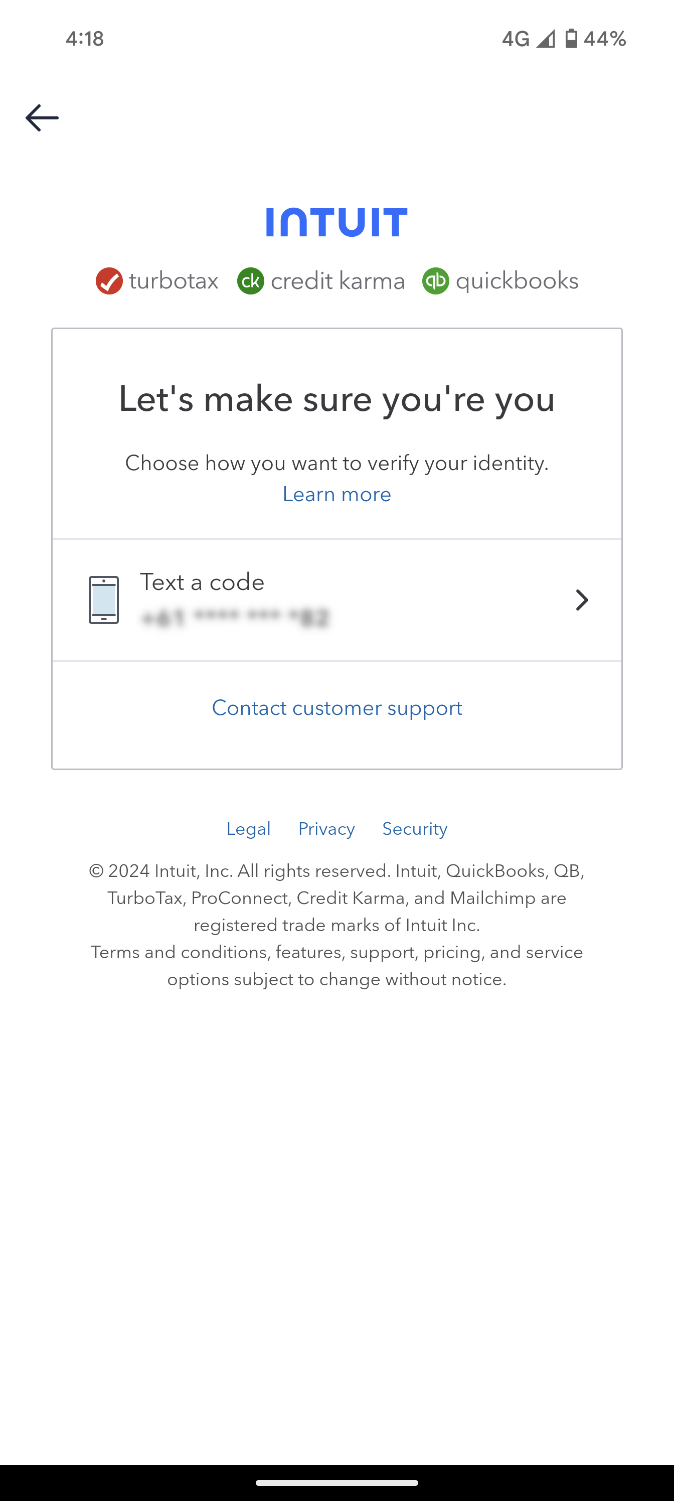 In order to ensure that your account is secure, Quickbooks will require you to verify your identity. Select the Text a code option.