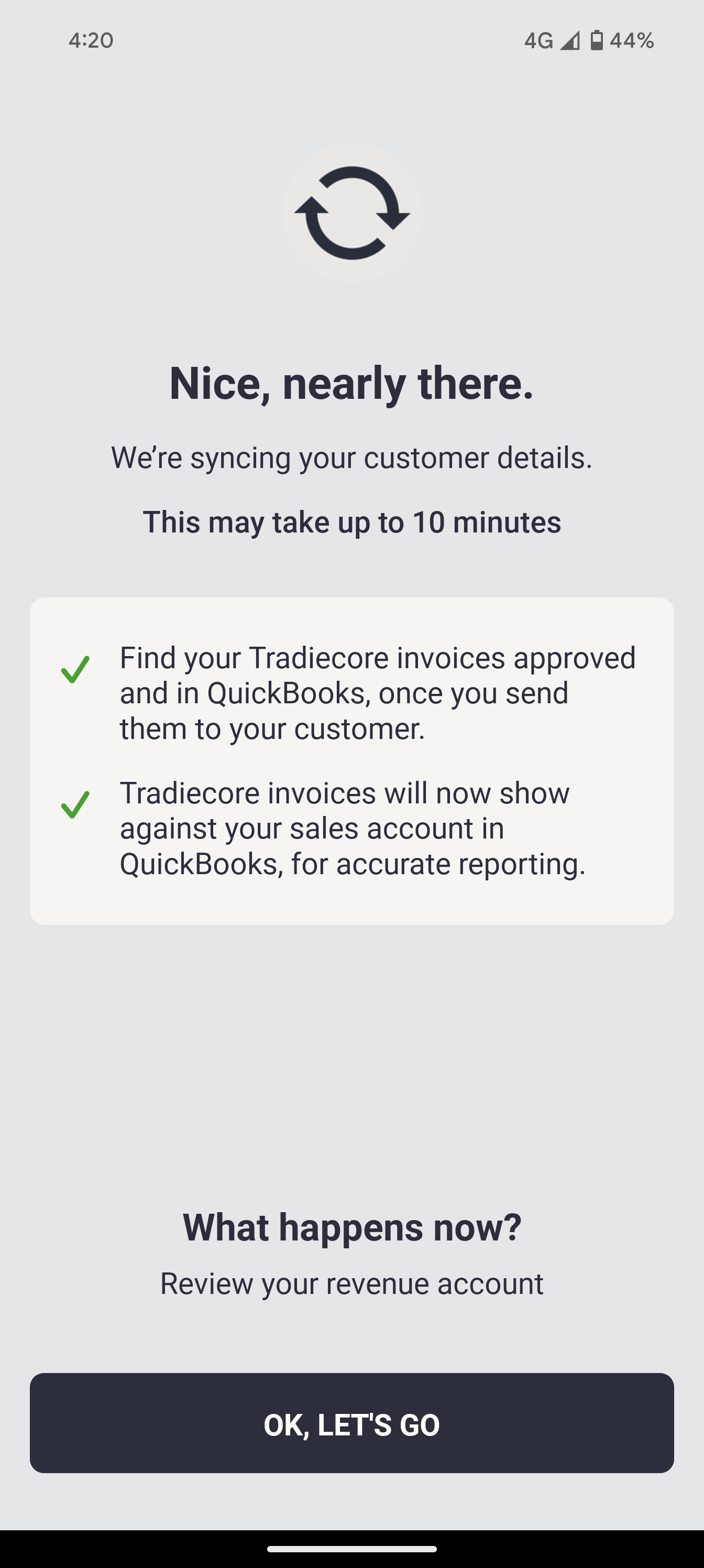 Your customer and invoice information will be automatically synchronised between QuickBooks and hipages tradiecore. This process may take up to 10 minutes. When complete, select Ok, lets go.