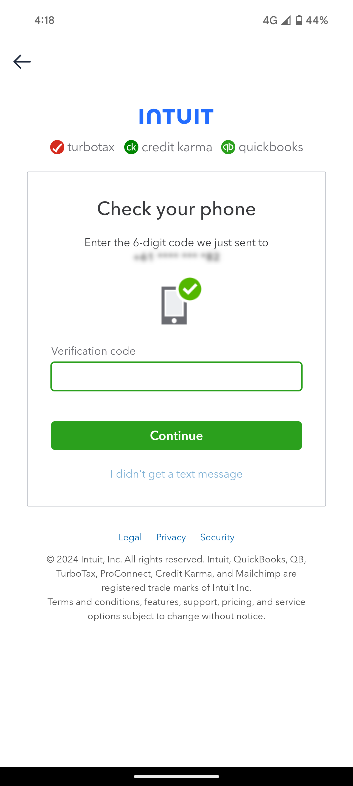 You will then be sent a 6-digit code to the phone number shown on the screen. This will be the phone number that you have associated with your Quickbooks account.
