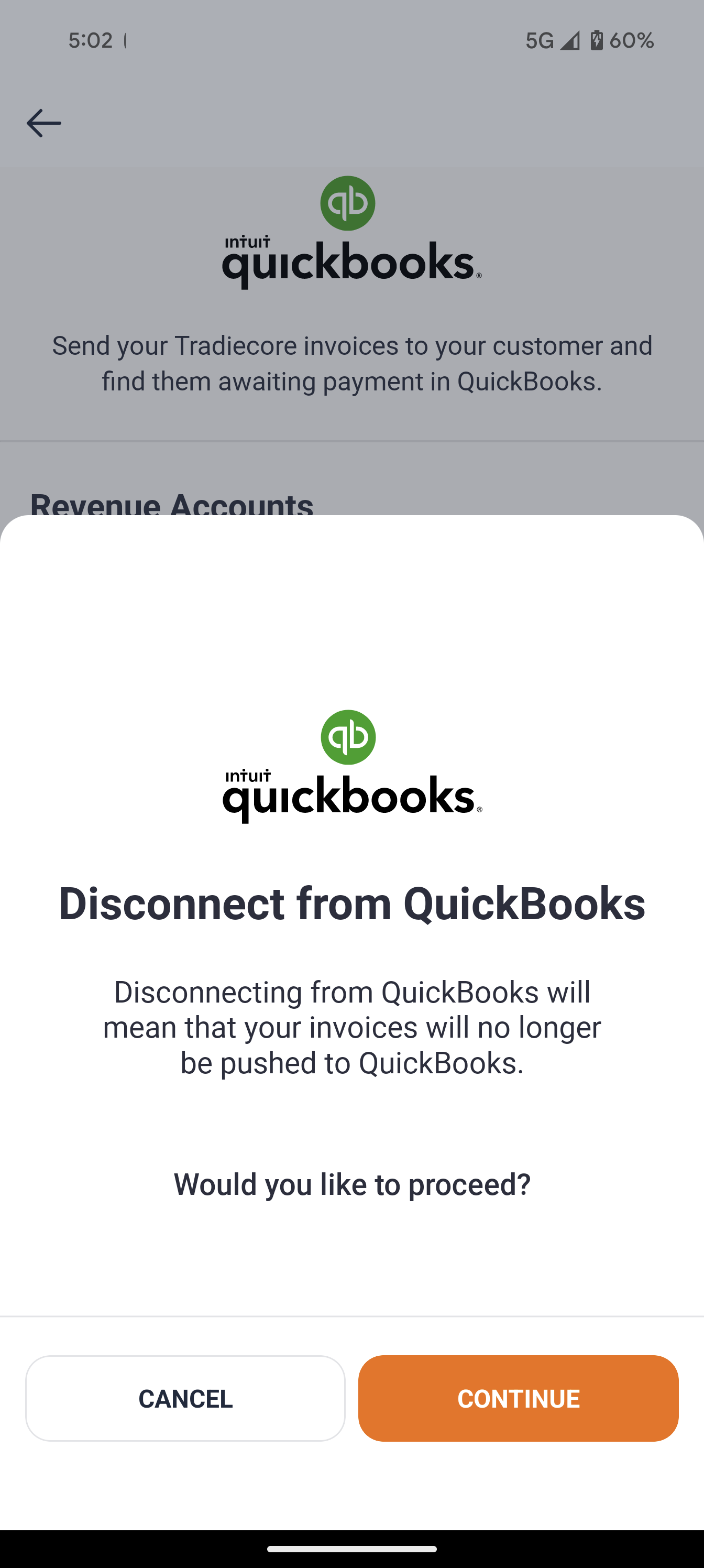 Select Continue to confirm that you want to disconnect your Quickbooks account.