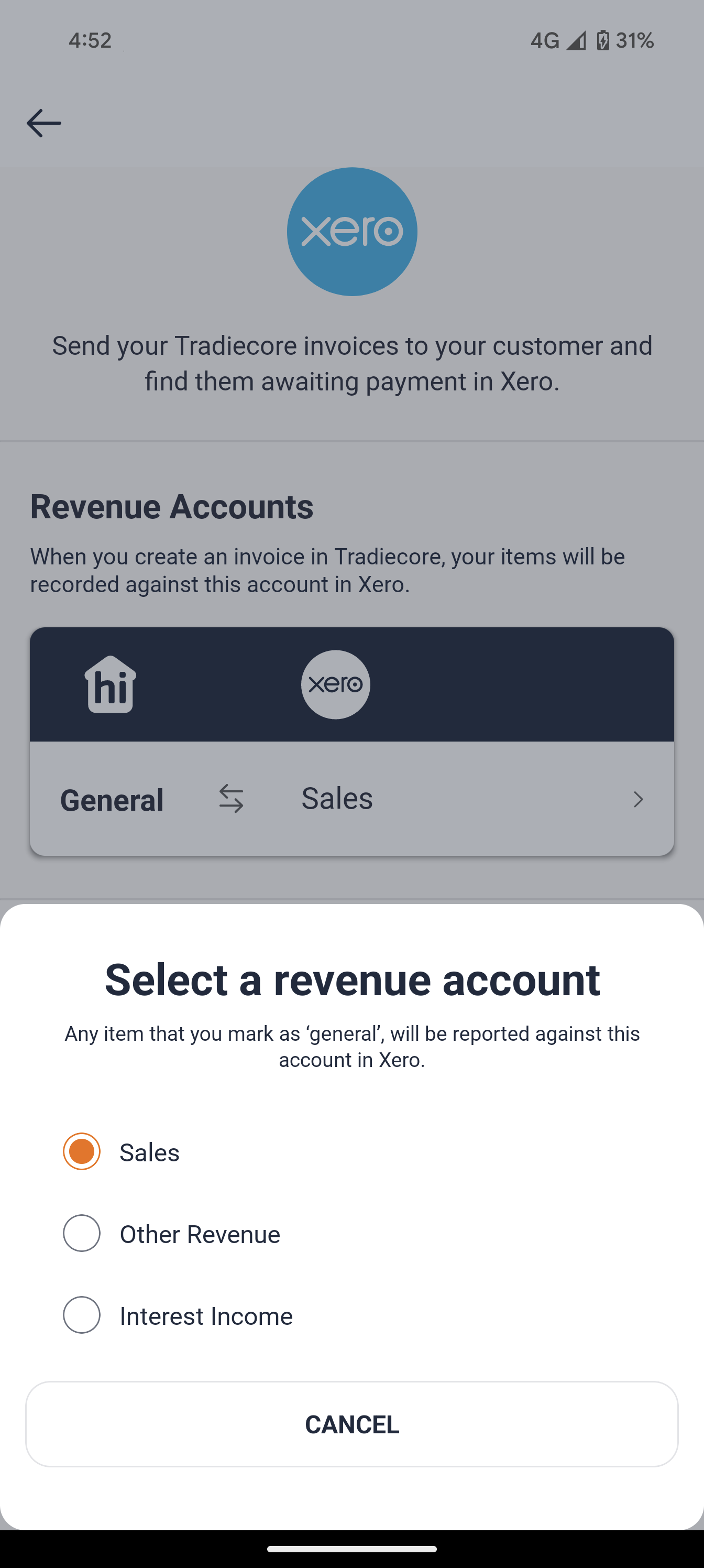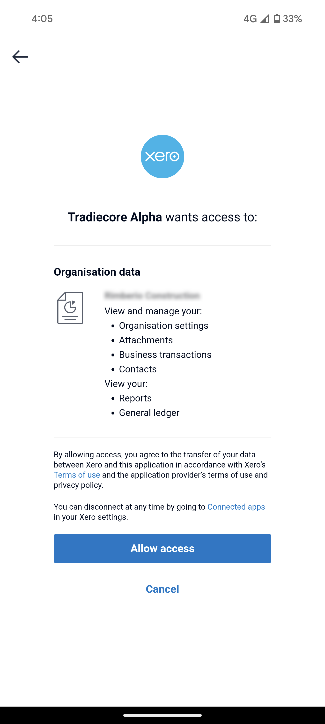 This is to confirm whether hipages tradiecore can have access to your Xero account. hipages tradiecore requires access so we can send invoice and accounting information to your Xero account automatically.