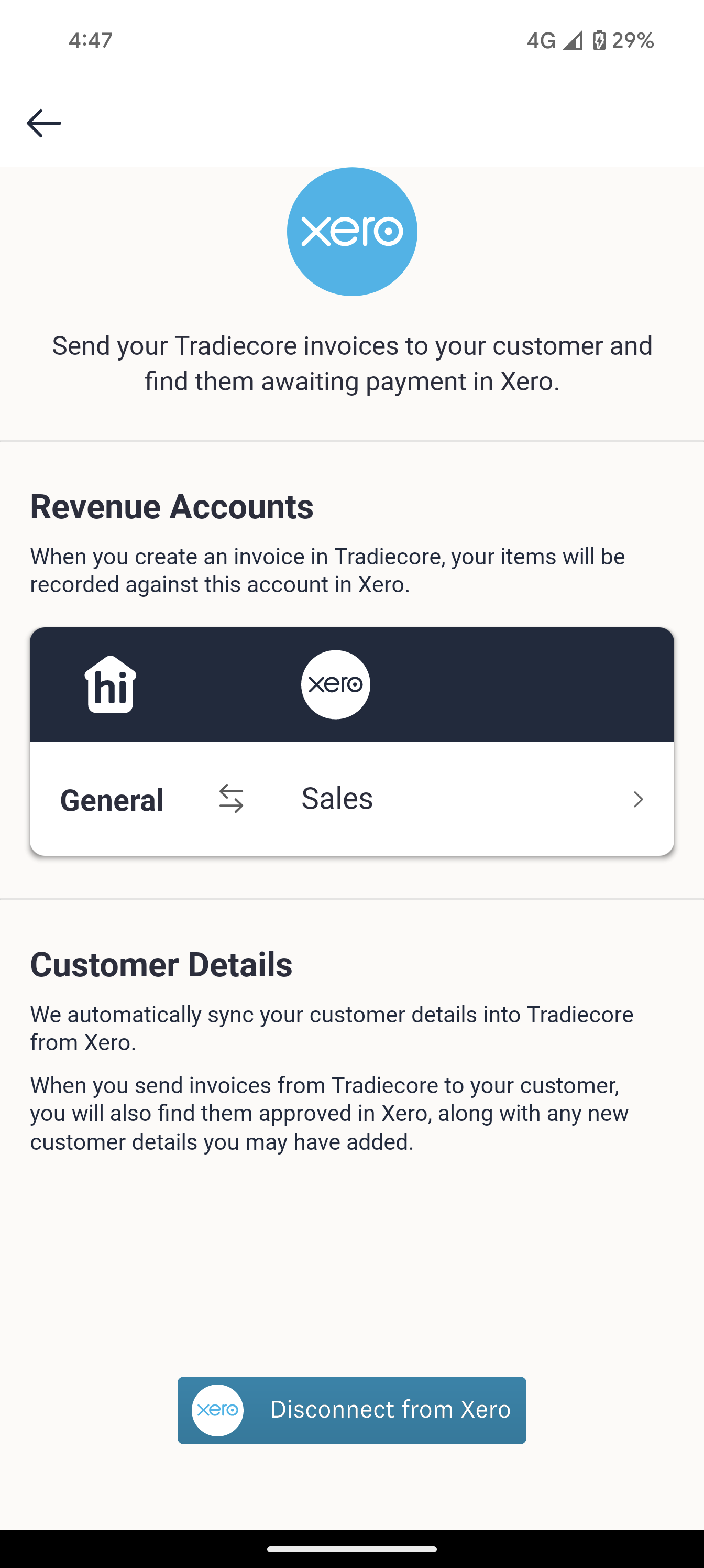 Follow the steps listed here to set up Xero integration with hipages tradiecore. hipages tradiecore supports full synchronisation with Xero. Any changes you make to an invoice in Xero are automatically updated in hipages tradiecore and any changes made in hipages tradiecore will be reflected in Xero.