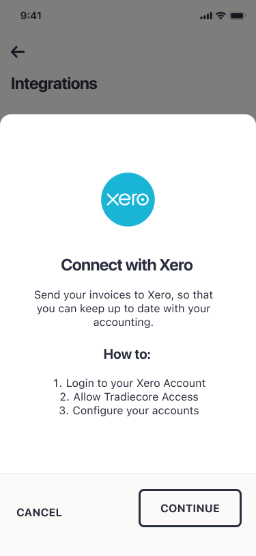 Select Continue to reconnect to Xero. Then follow the listed above to reconnect Xero to hipages tradiecore again.