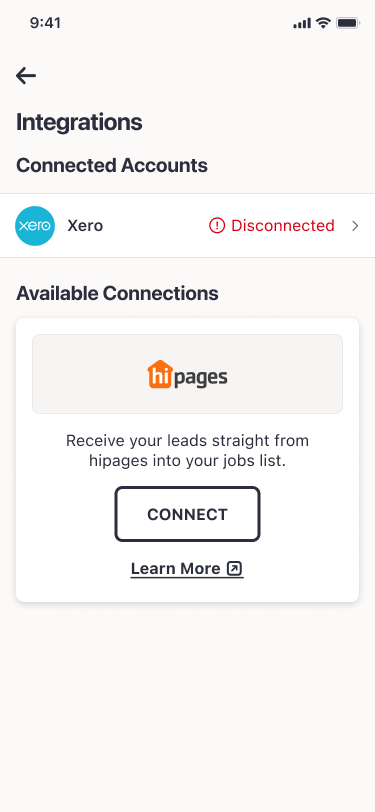 If your Xero account has been disconnected from hipages tradiecore, it is indicated with red Disconnected text on the Integrations screen. Select Xero to reconnect.