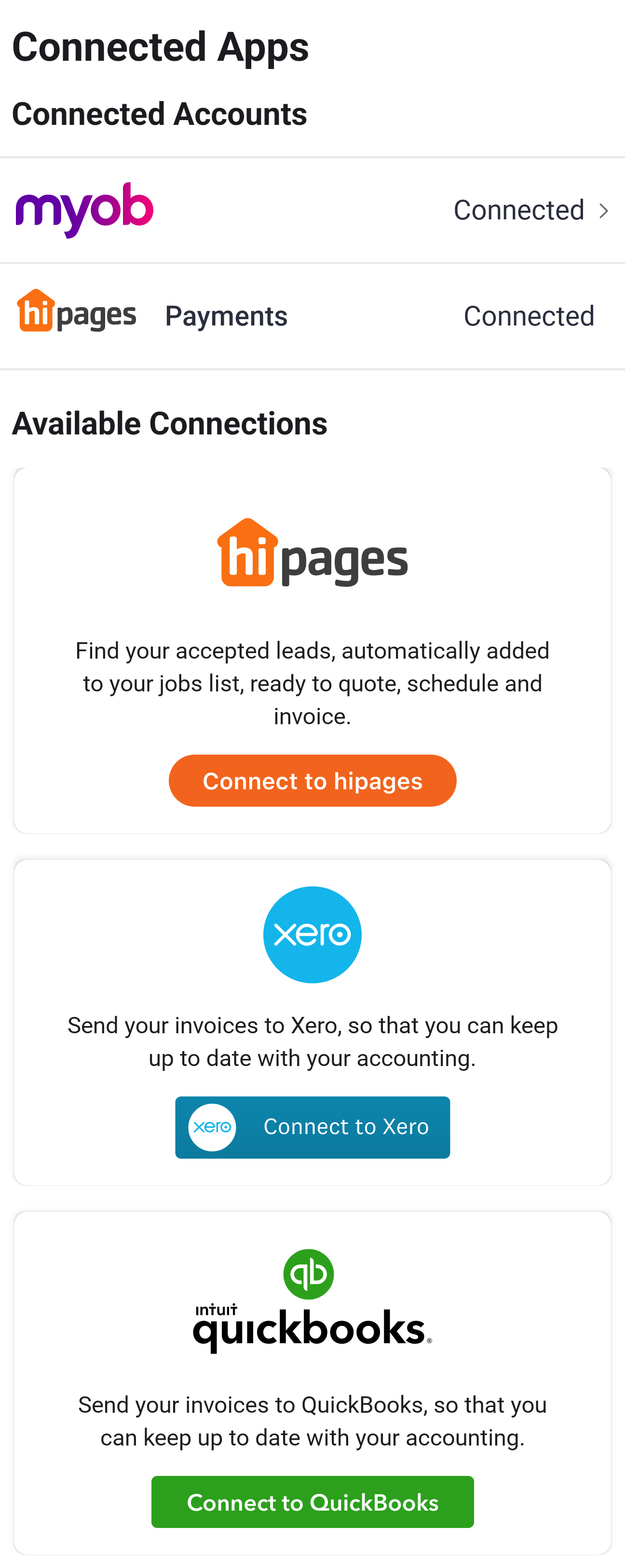 The Connected Apps screen will also be updated to show that you are now connected with hipages.