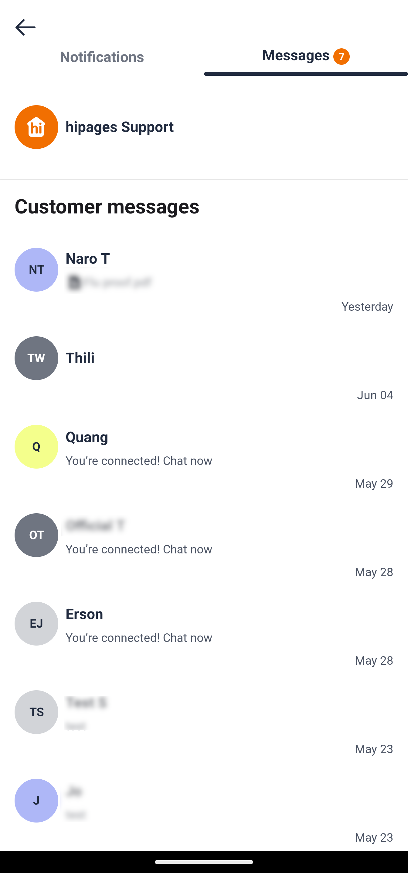 At the top of the Messages tab, you’ll see a dedicated thread for hipages Support — making it quick and easy to get in touch when you need help. Below that, your customer messages are sorted by contact and date.