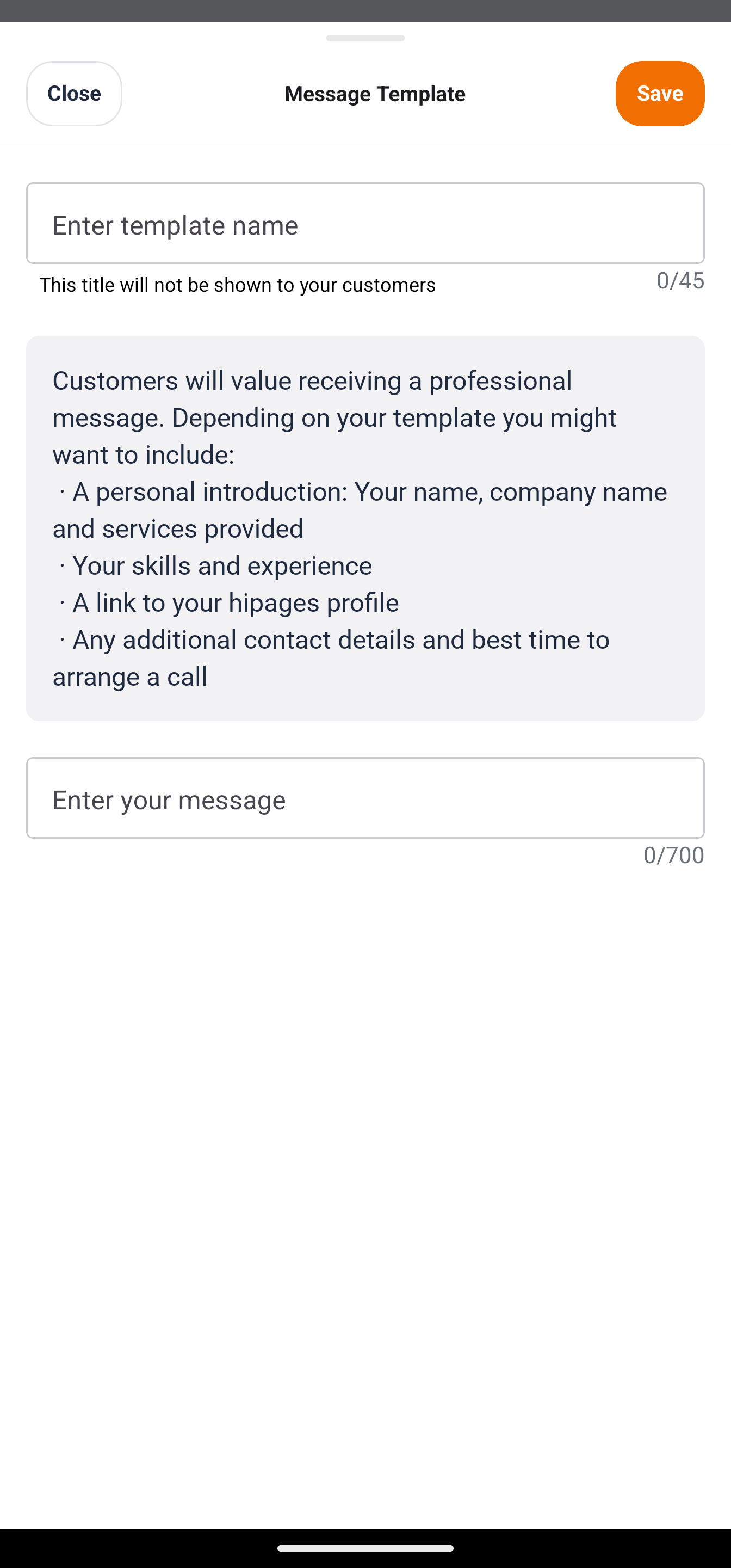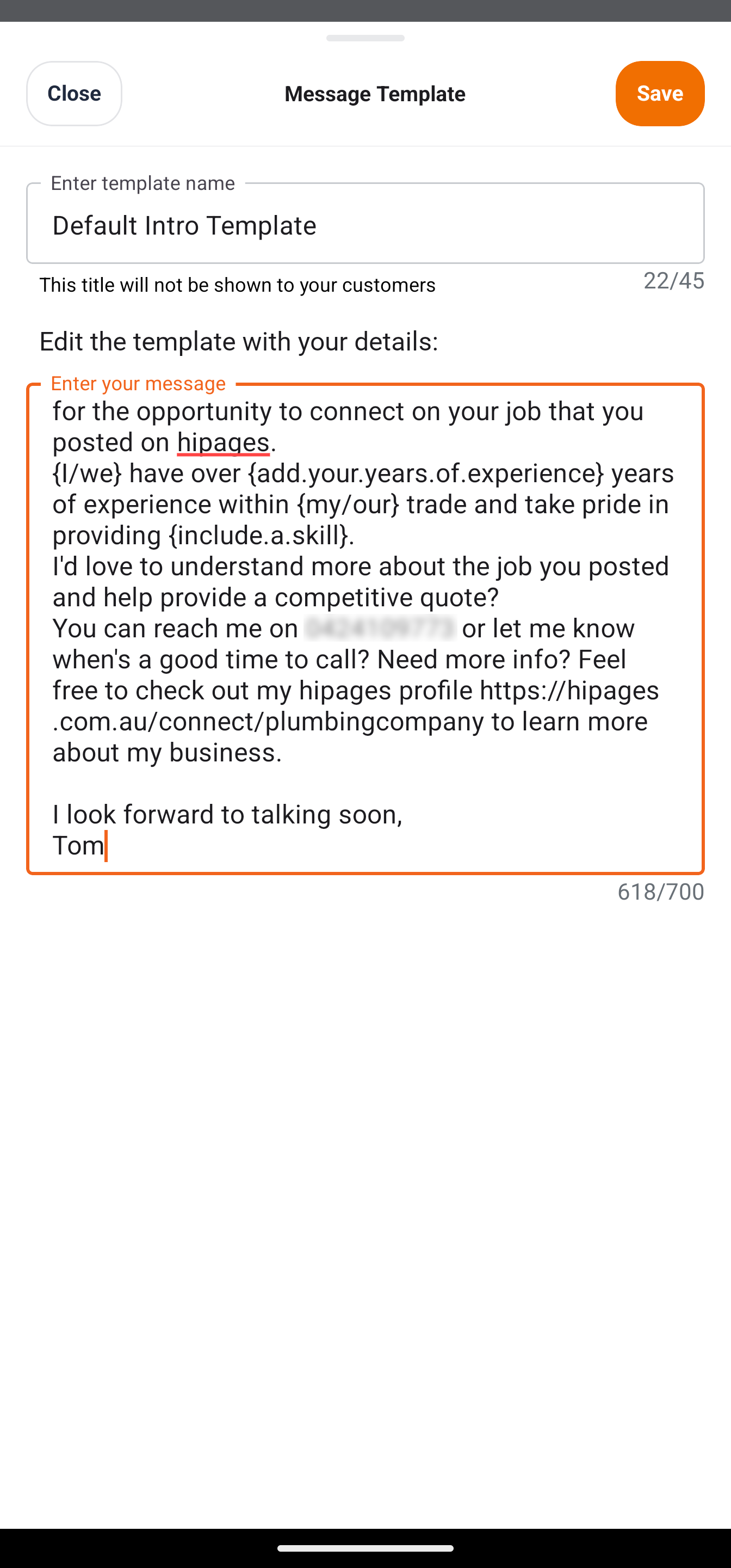 hipages tradiecore provides suggested templates pre-filled with details from your business profile. You can edit these templates to suit your tone, or create new ones from scratch.