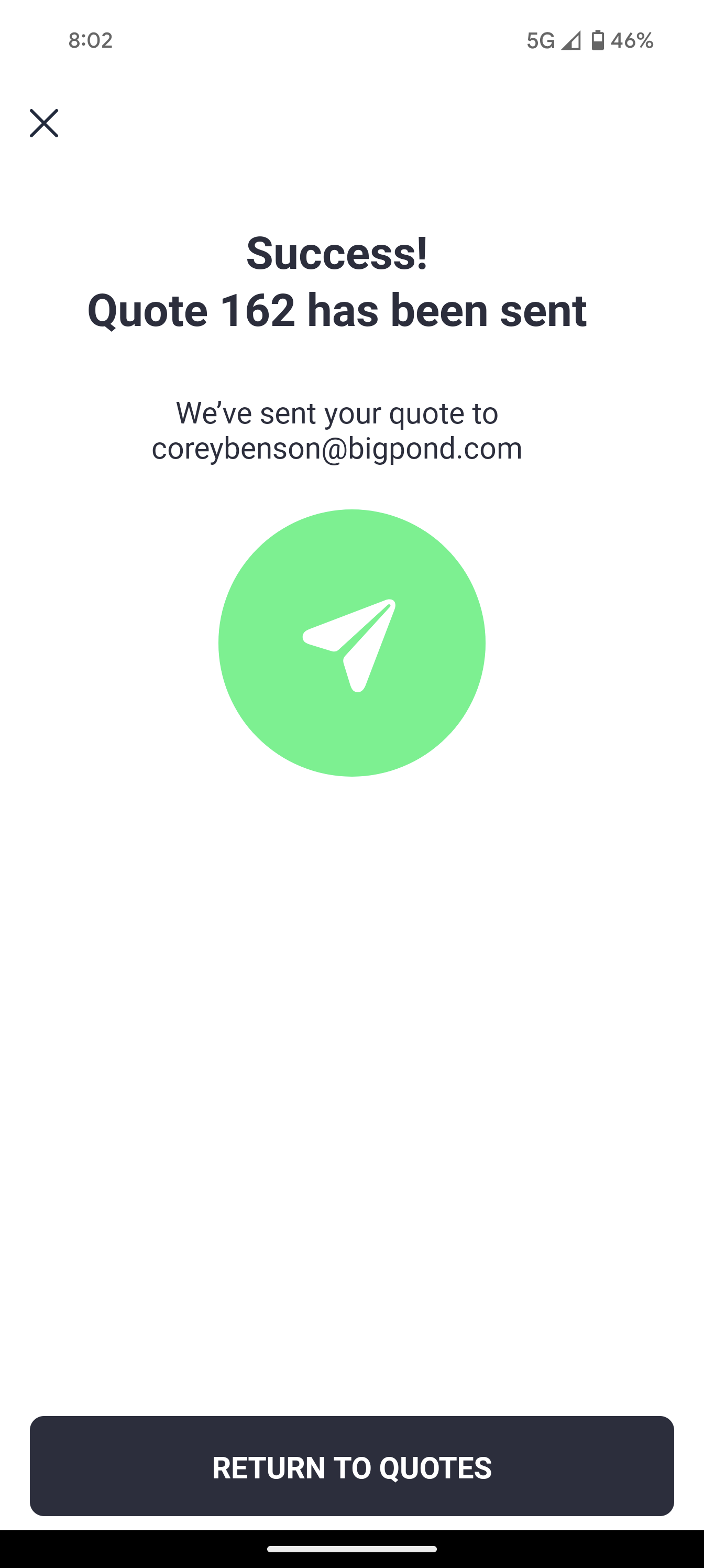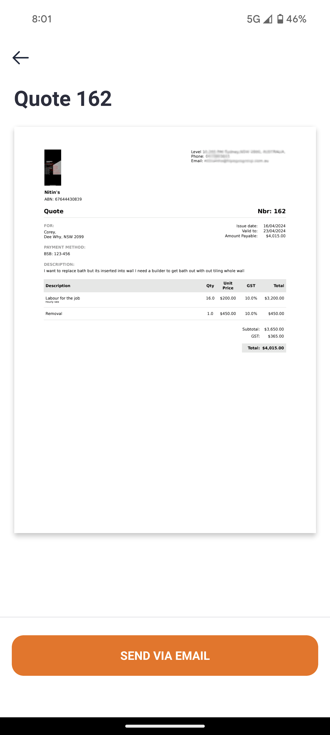 A success screen is shown when the quote or invoice has been sent.