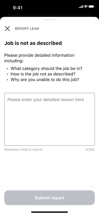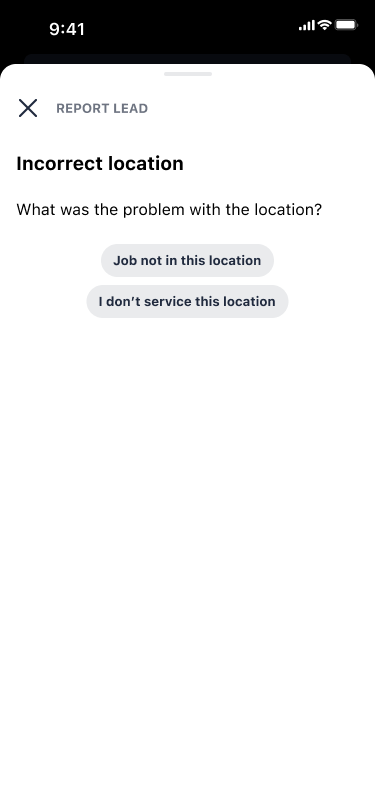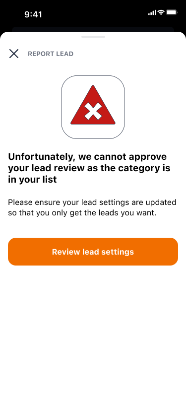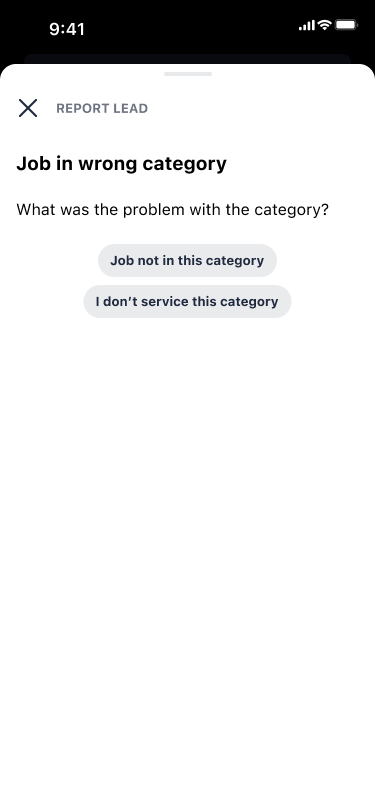 Select this option if the lead that you accepted should belong to a different category to the one specified on the lead information screen or if you have received a lead from a category that you do not service. When you select this option, you will be further prompted to specify if the job is not in the specified category or whether you do not service the category.