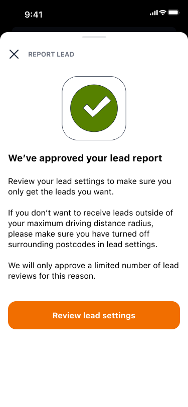 If you selected the I don't service this location option, a confirmation message about your lead report will be displayed and you will be prompted to review and change your lead settings. It is recommended that you turn off the postcodes that you do not want to service and receive leads for, see Changing coverage areas for more information.
