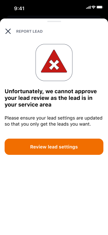 Select this option if the location of the lead that you accepted is different to the location specified on the lead information screen. When you select this option, you will be further prompted to specify if the job is not in the specified location or whether you do not service the area of the lead.