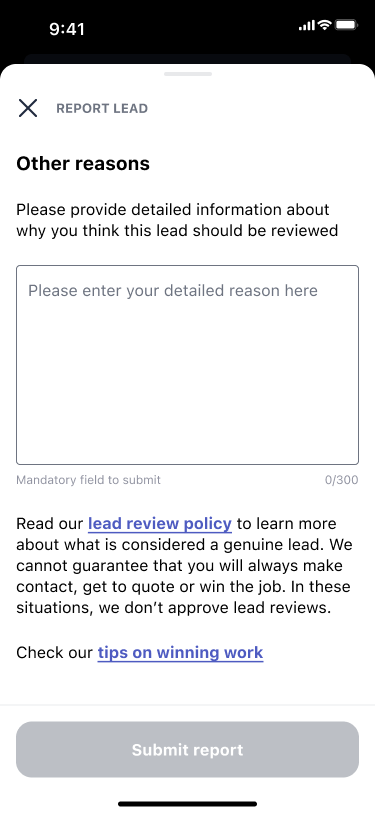Select Provide other reason details. The Other reasons screen is then displayed prompting you to enter details about why you think the lead should be reviewed.