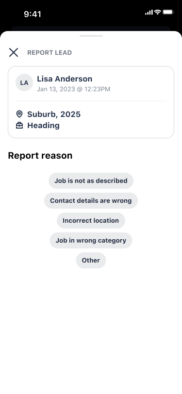 The lead reporting option in hipages tradiecore lets you report a lead to hipages support. The option of reporting a lead to hipages support is only applicable for 7 days after you accept a lead. Once you report a lead hipages support will review your report and provide a resolution within 5 business days. If your report is considered as valid, hipages will credit the value of the lead back to your lead credit balance.