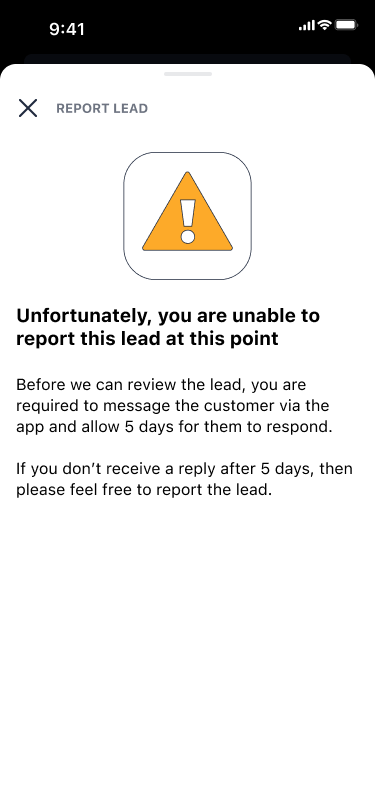 If you are attempting to report a lead within 5 days of accepting the lead, you will not be able to proceed and the following message will be displayed.
