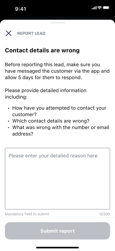 Select this option if both the phone number and email address are wrong, and the customer has not responded via the Message Centre. When you select this option, the Report Lead pop-up changes to prompt for more information.
