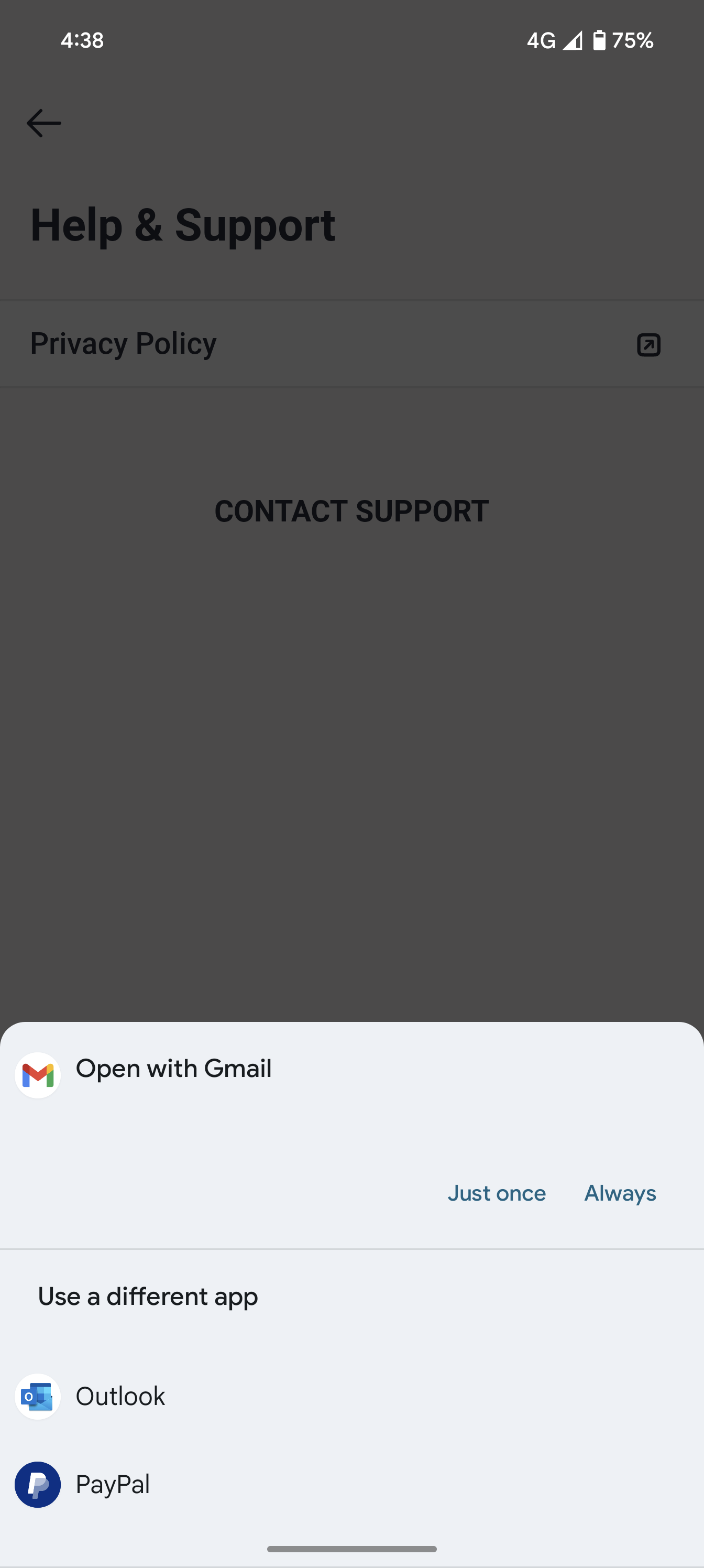 support@tradiecore.com.au. A pop up menu with the email apps available on your phone is displayed.
