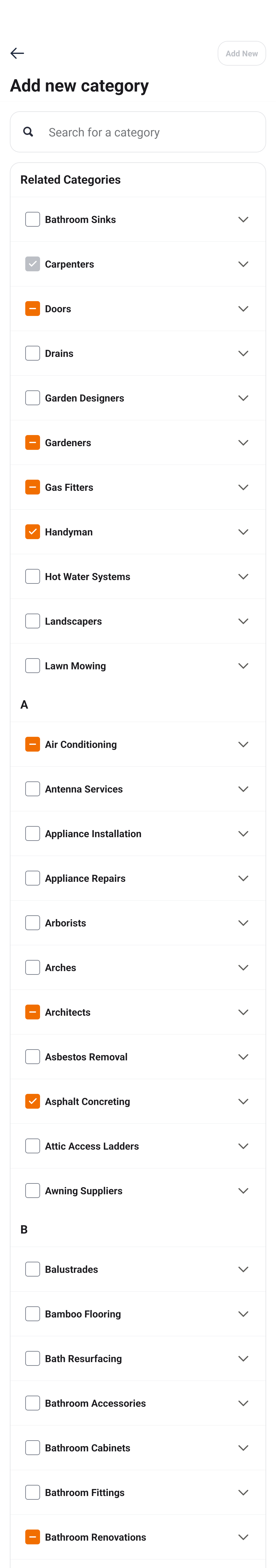 . This displays the Add new category screen. The screen shows categories that are related to your previous selections on the top. All other service categories are listed in alphabetical order.