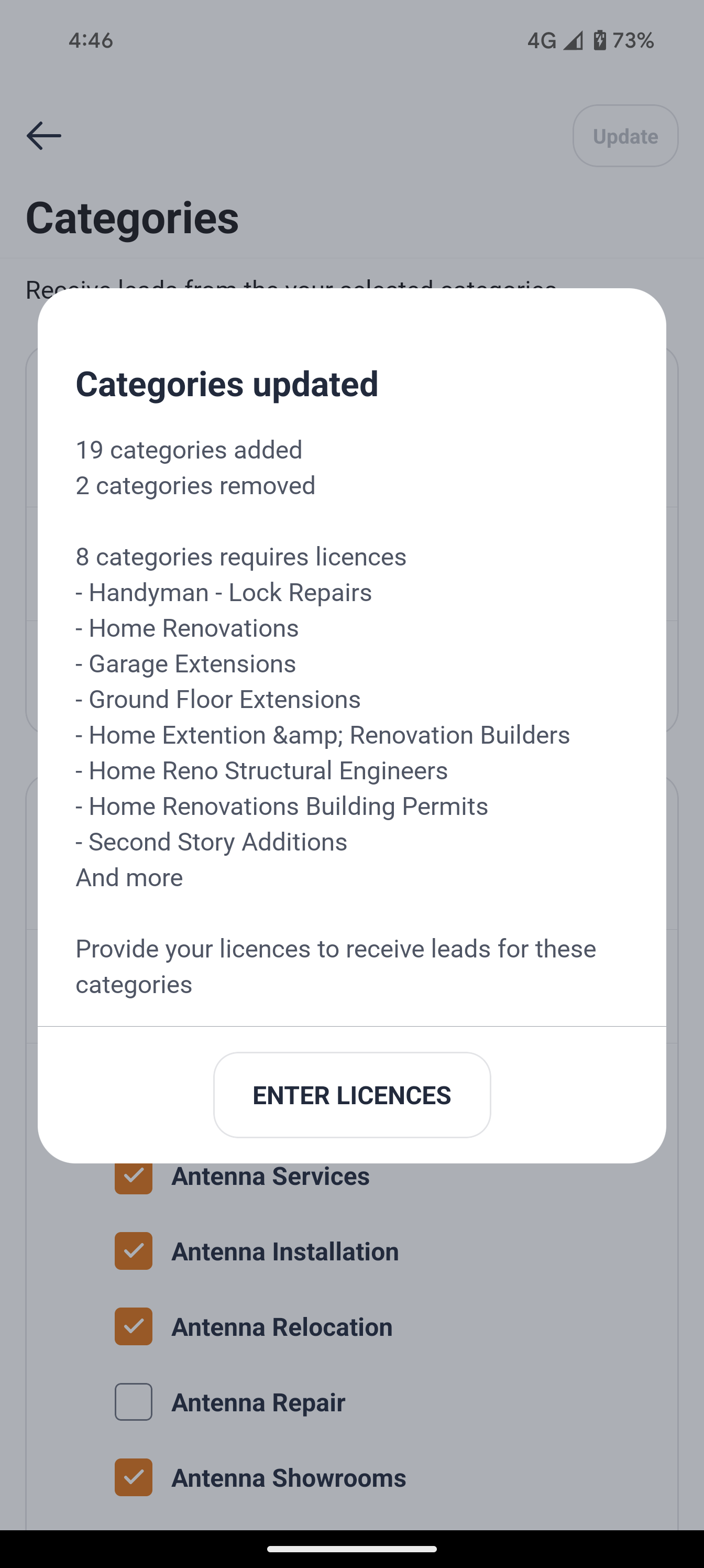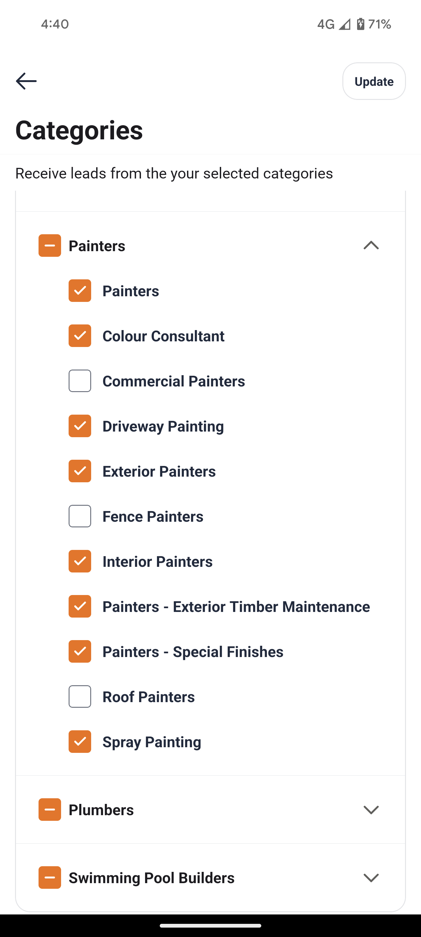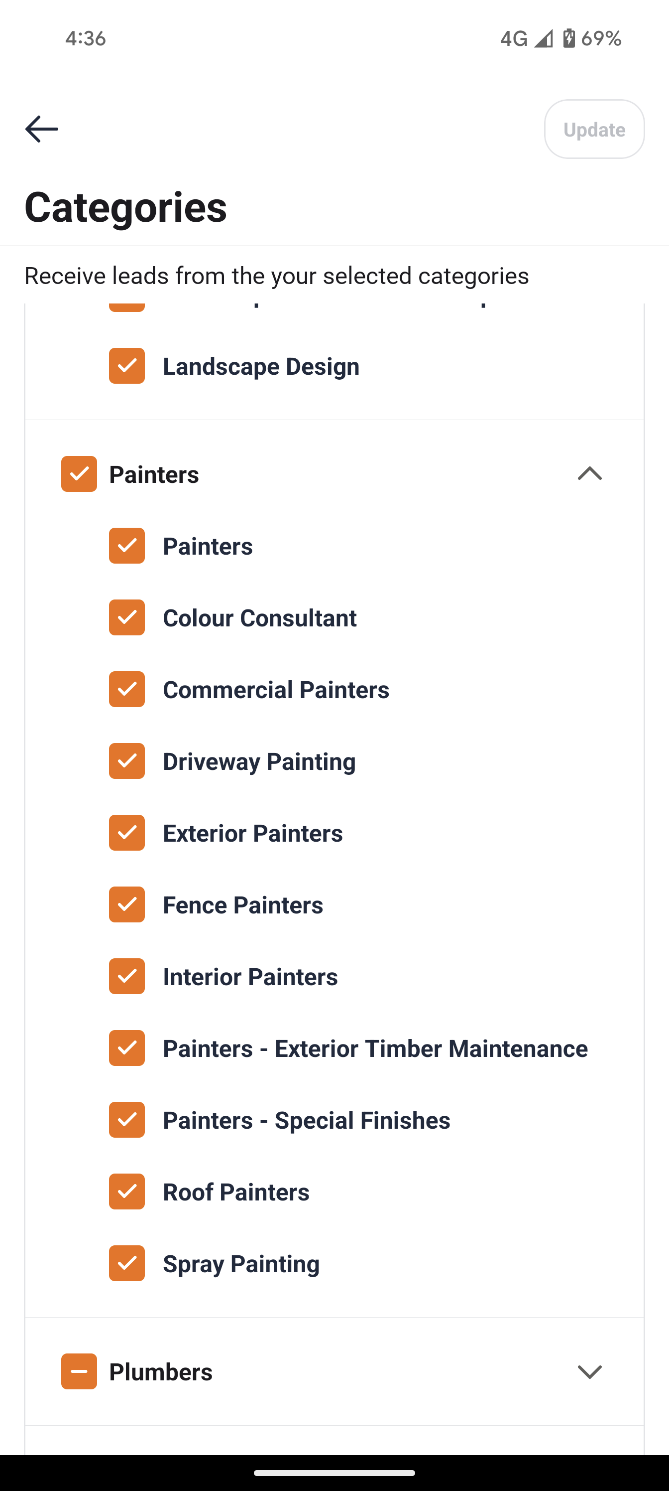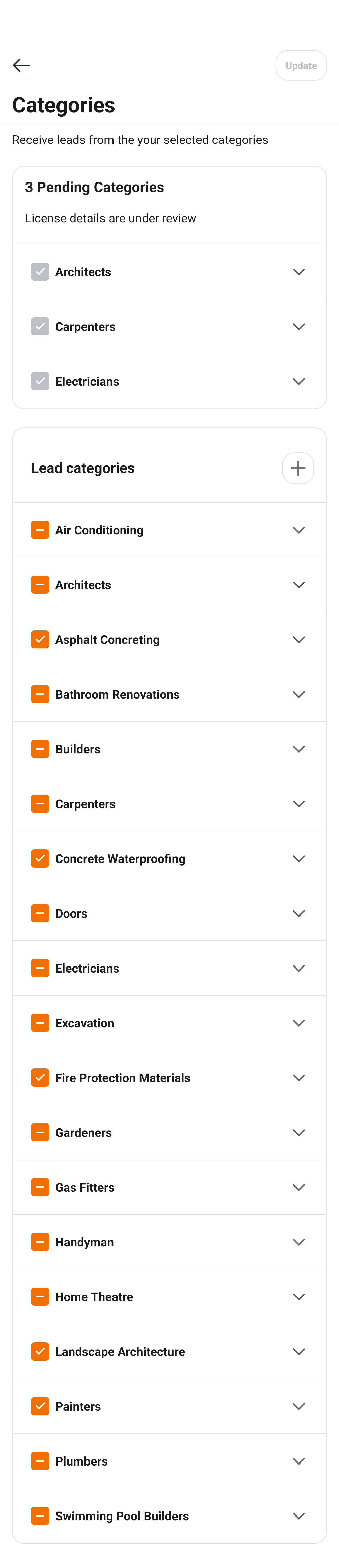 If the checkbox next to a main category has a tick mark, it indicates that you have selected all the sub categories as services you provide to your customers.