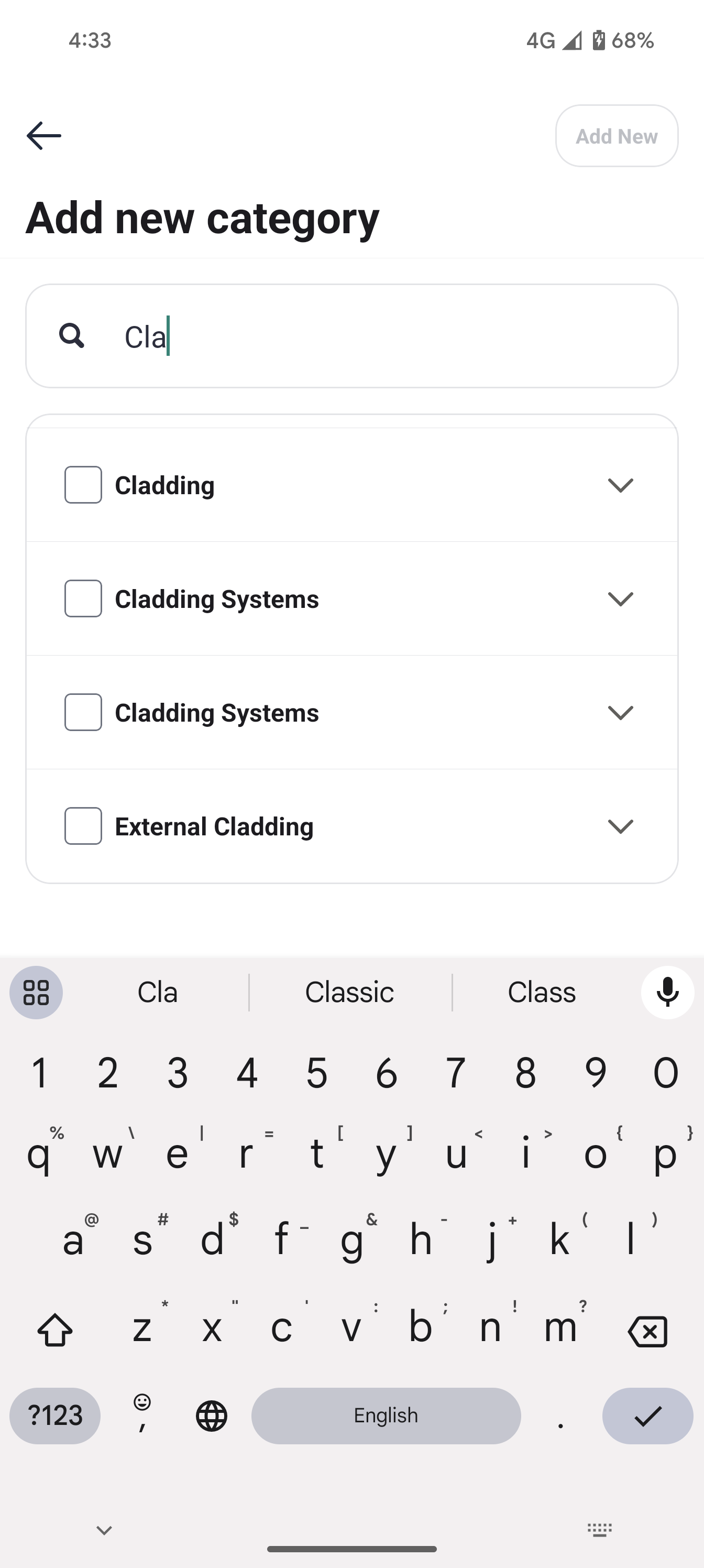 In the Add category screen, either use the search option to look for a specific category or, move down the list of all available categories (the categories are listed in alphabetical order).