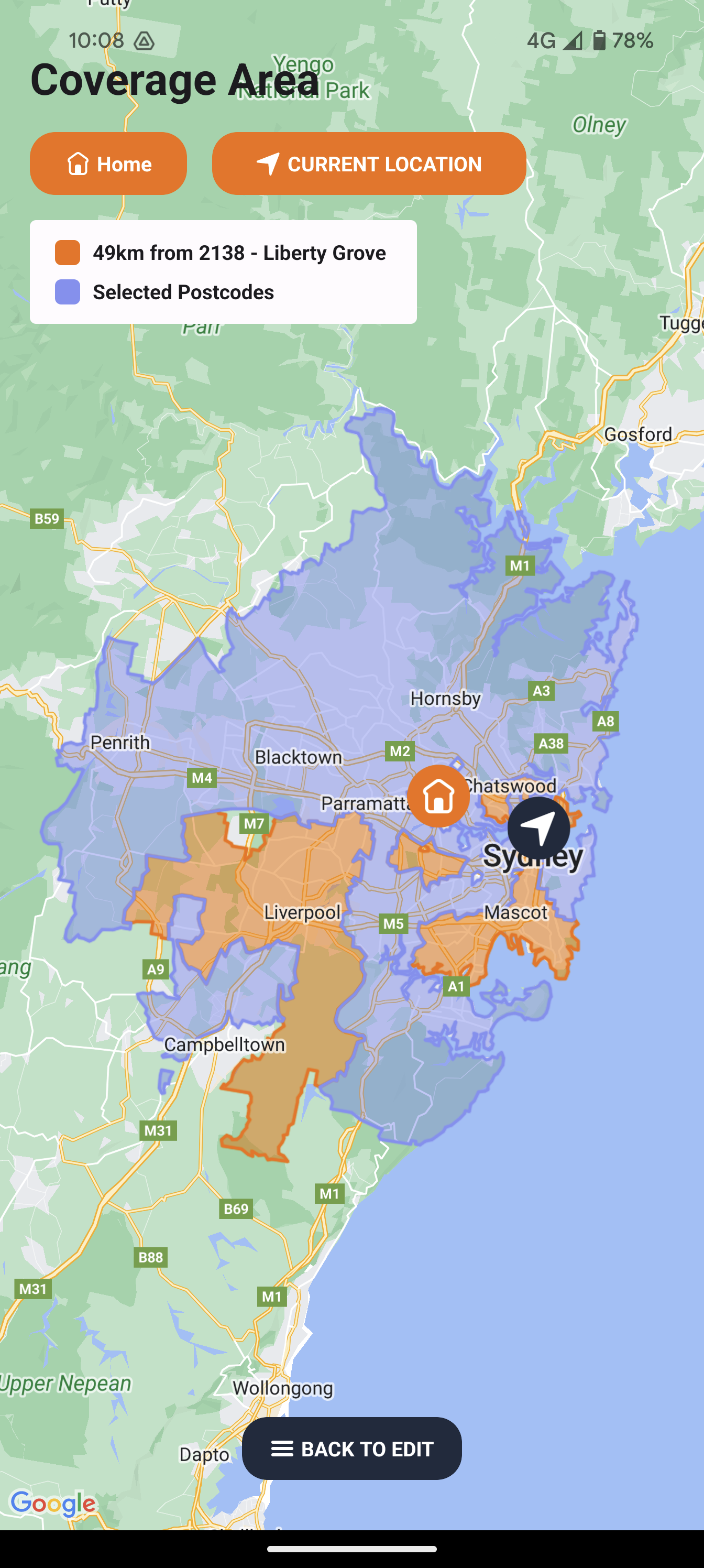 It is recommended that you customise the areas that you prefer to work in. To customise and change your coverage areas, see Changing coverage areas. Once you customise your coverage area, the area in blue shows all suburbs you are eligible to work in according to your from postcode and maximum driving distance and the area highlighted in orange shows you all the suburbs and postcodes that you have chosen to work in.