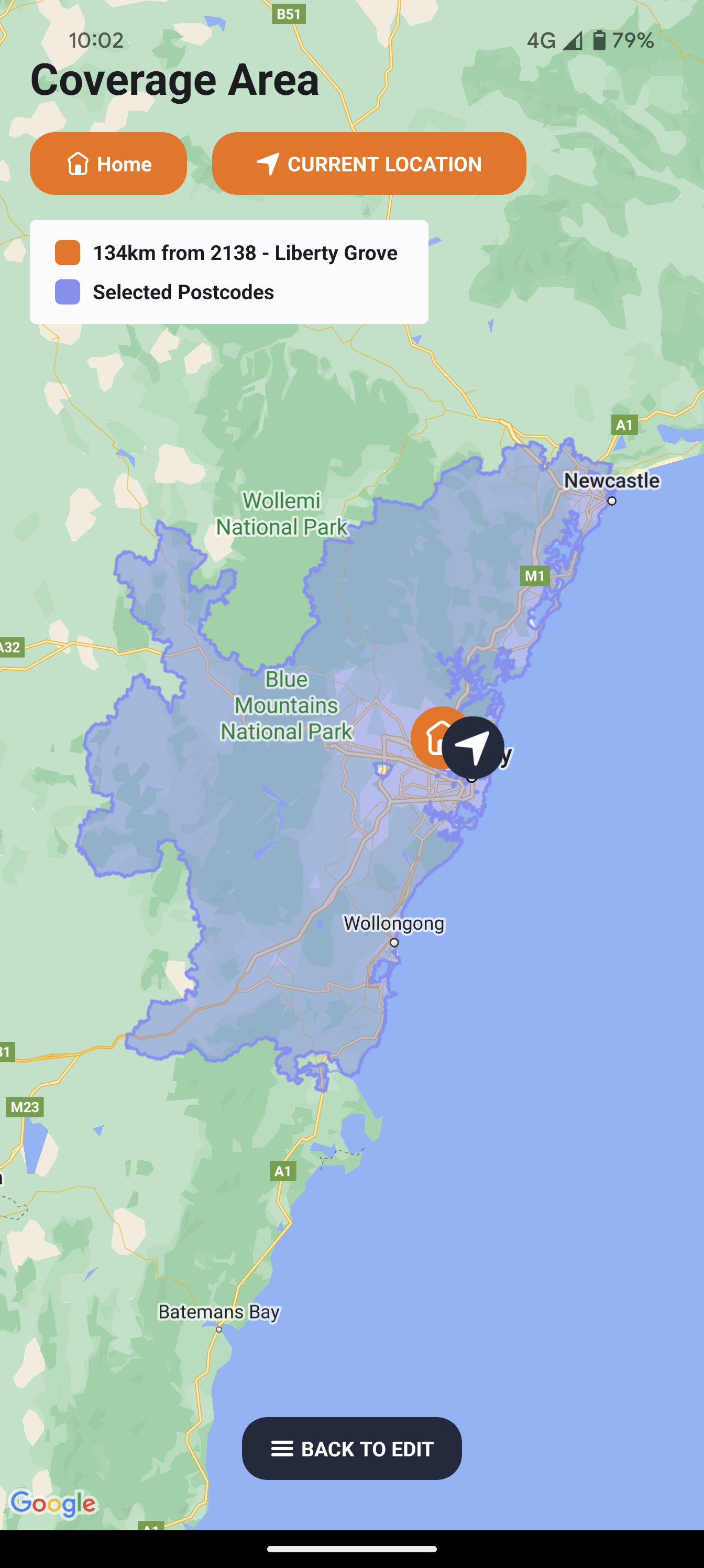 The map view shows the full area that you are eligible to provide service in according to your from postcode and the maximum driving distance that you have entered. Your from postcode is indicated with a home icon.
