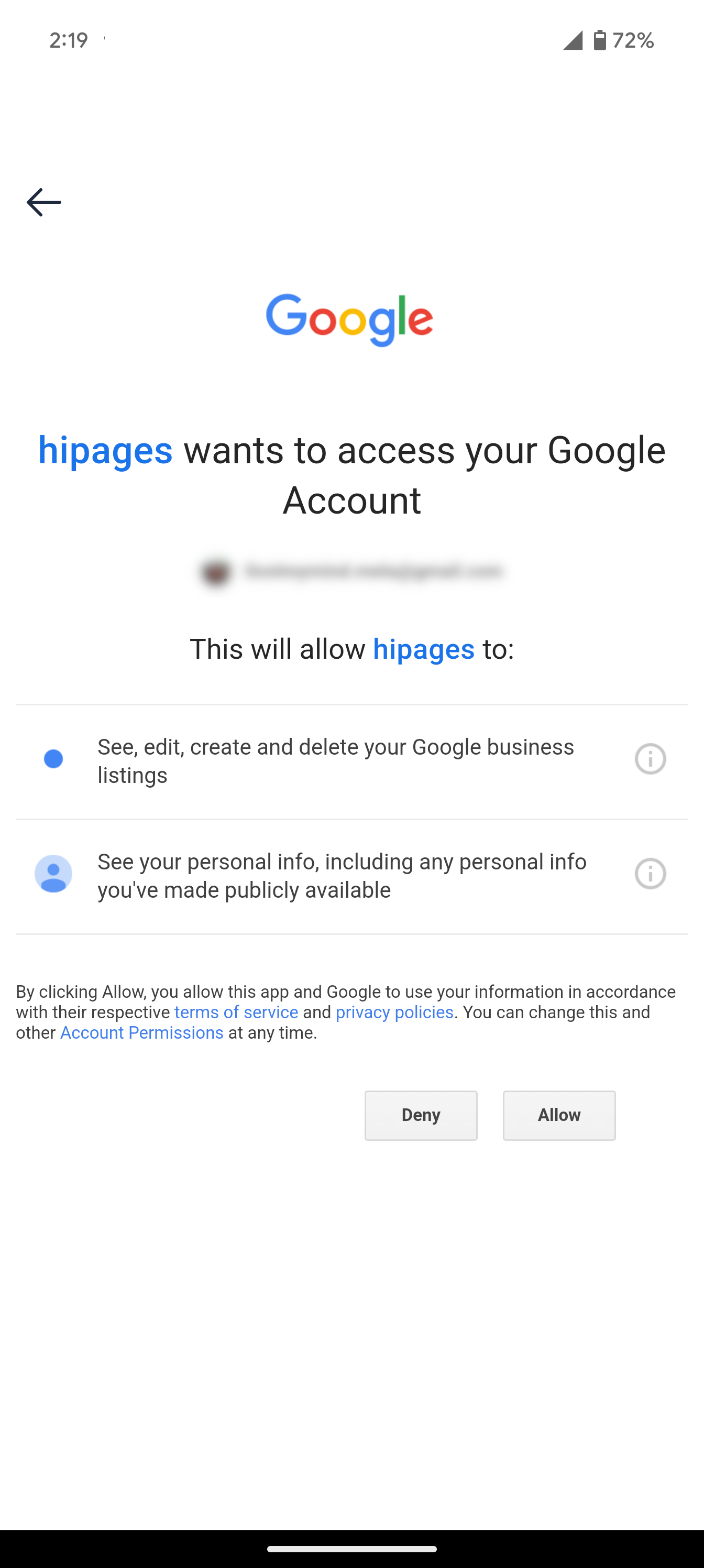 You will be asked to grant hipages permission to access your Google account in order to view your customer reviews. To proceed, select Allow to grant the necessary access.