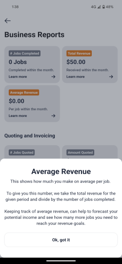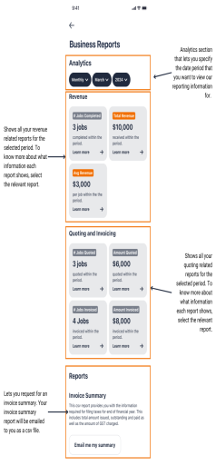 The Business Reports option shows you a range of reports containing important metrics about your business. You can filter and view reports for specific time periods as needed. The reports are sectioned into two categories; revenue related reports and quoting and invoicing related reports.