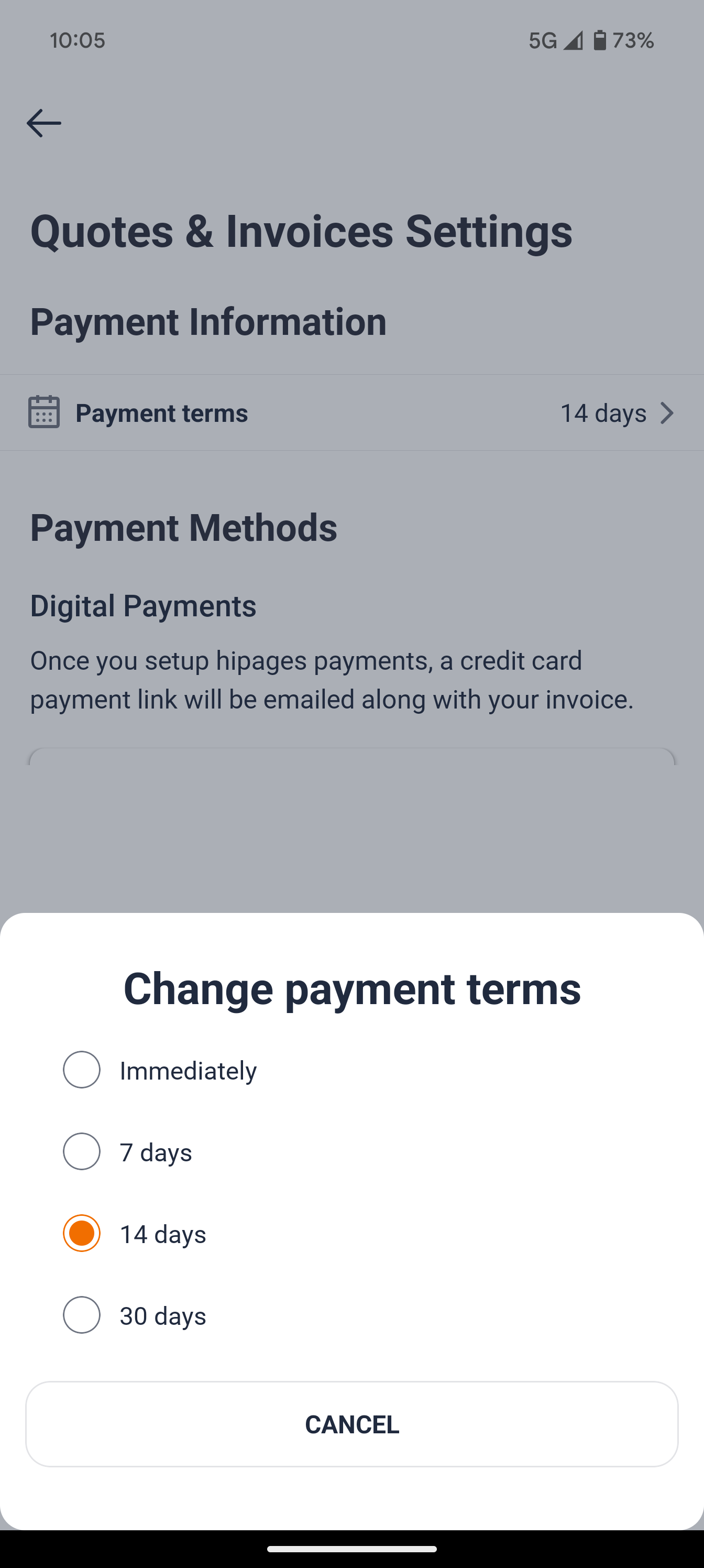 The terms that you specify here act as the default terms for the hipages tradiecore app. You can change the payment terms on a per-invoice basis if needed, on the invoice screen. For more information, see Creating a new invoice