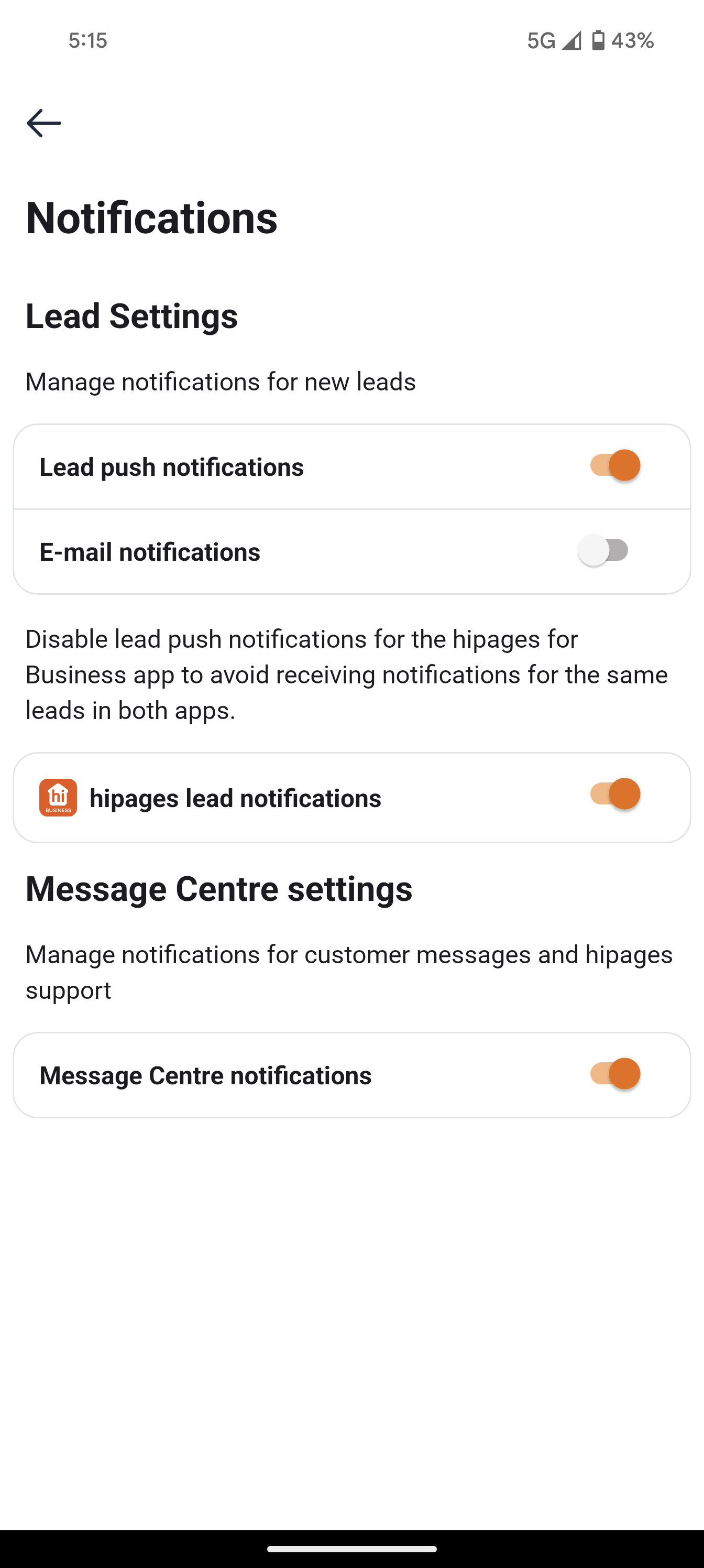 To enable push notifications in hipages tradiecore to receive notifications about leads, turn on the Lead notifications option. When you turn on the option it will turn orange.