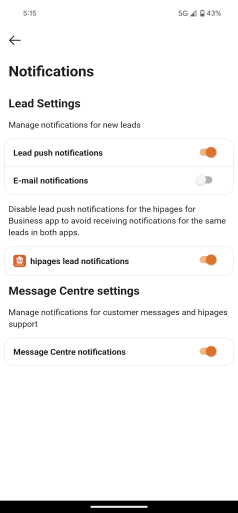 By default, hipages lead notifications will be turned on. It is recommended that you turn off notifications in the hipages app, if you turn on notifications in hipages tradiecore.