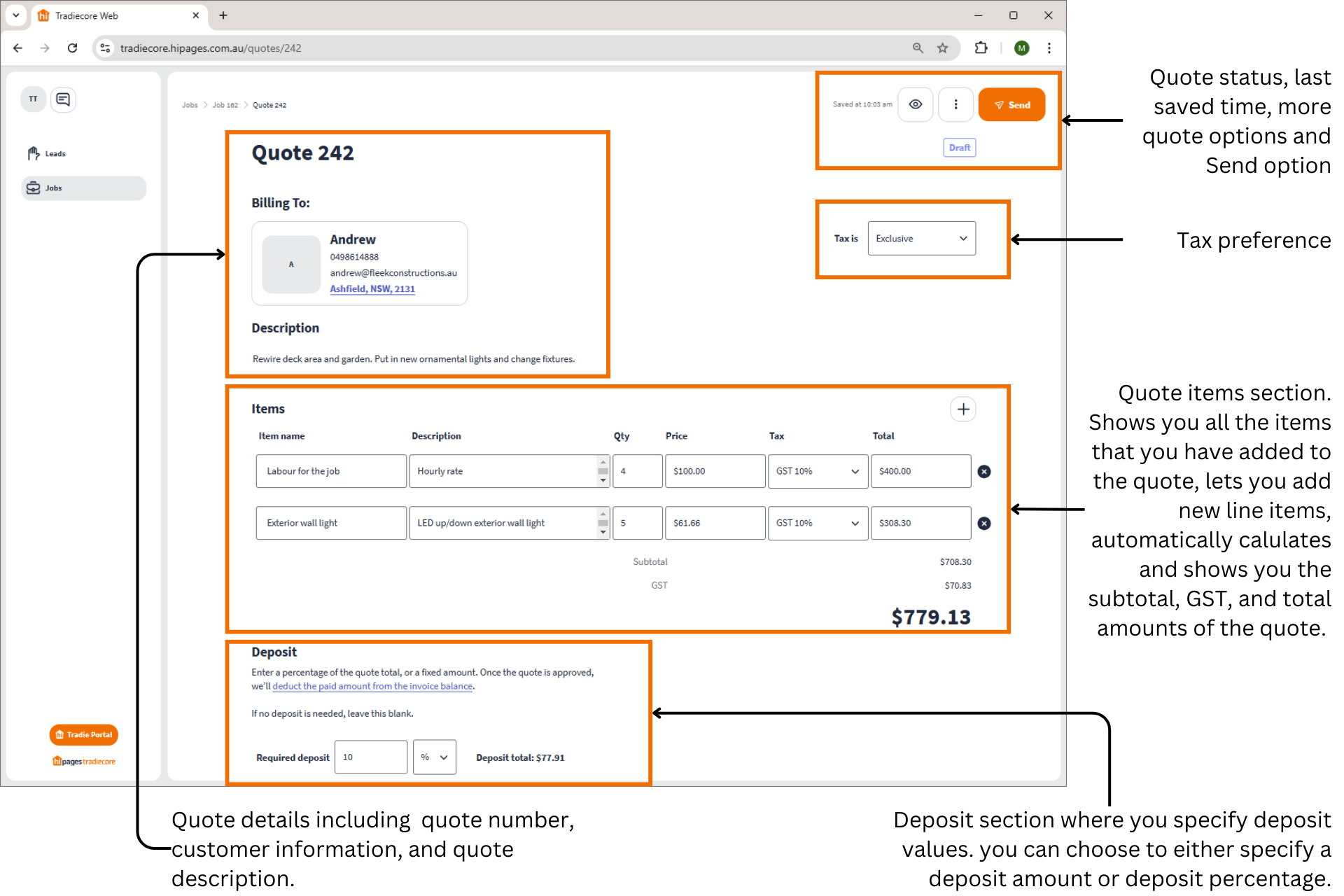 Every quote on the Quotes list is associated with a job in hipages tradiecore, you cannot have quotes that are not linked to a job. You can send multiple quotes for a job as needed. For a quote to be considered accepted by a customer, the customer must approve it by either selecting Approve on the quote email or by paying a deposit.